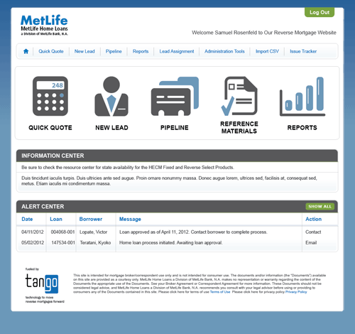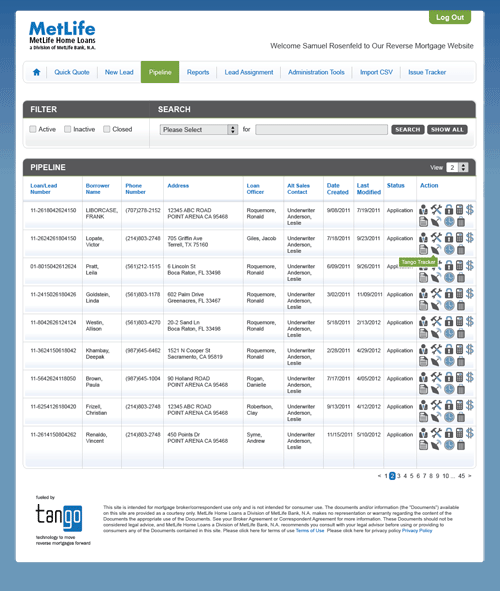 Scope: Resign an internal web based loan origination system called Tango, for reverse mortgages. The primary focus was to focus more on the organization of the content so that the various user groups (Lead Mgt, loan officers, Underwriters, Finance...etc.) could navigate effectively and retrieve the necessary information. The secondary focus was to create a design that allowed for the content to be displayed in a format that was very user friendly.