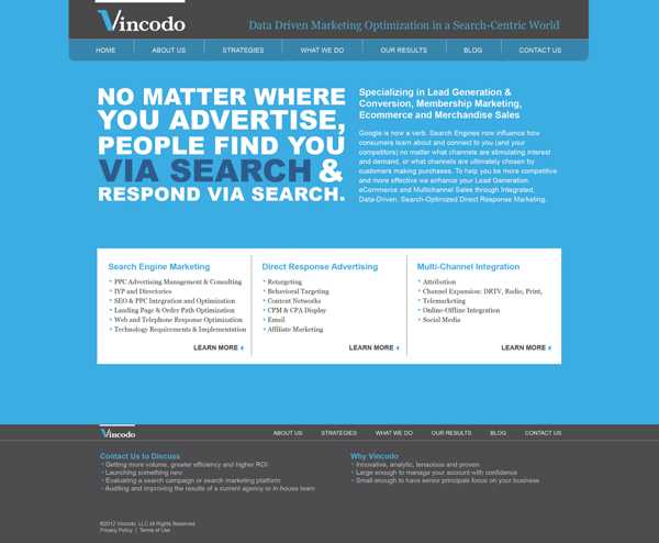 Scope: Vincodo requested that their brand identity along with their web site be given a fresh face. DblYolks created a clean, focused solution which elevated the firm's virtual face. The secondary focus was to create a design that allowed for the content to be displayed in a format that was visually compelling and offered a user friendly interface.